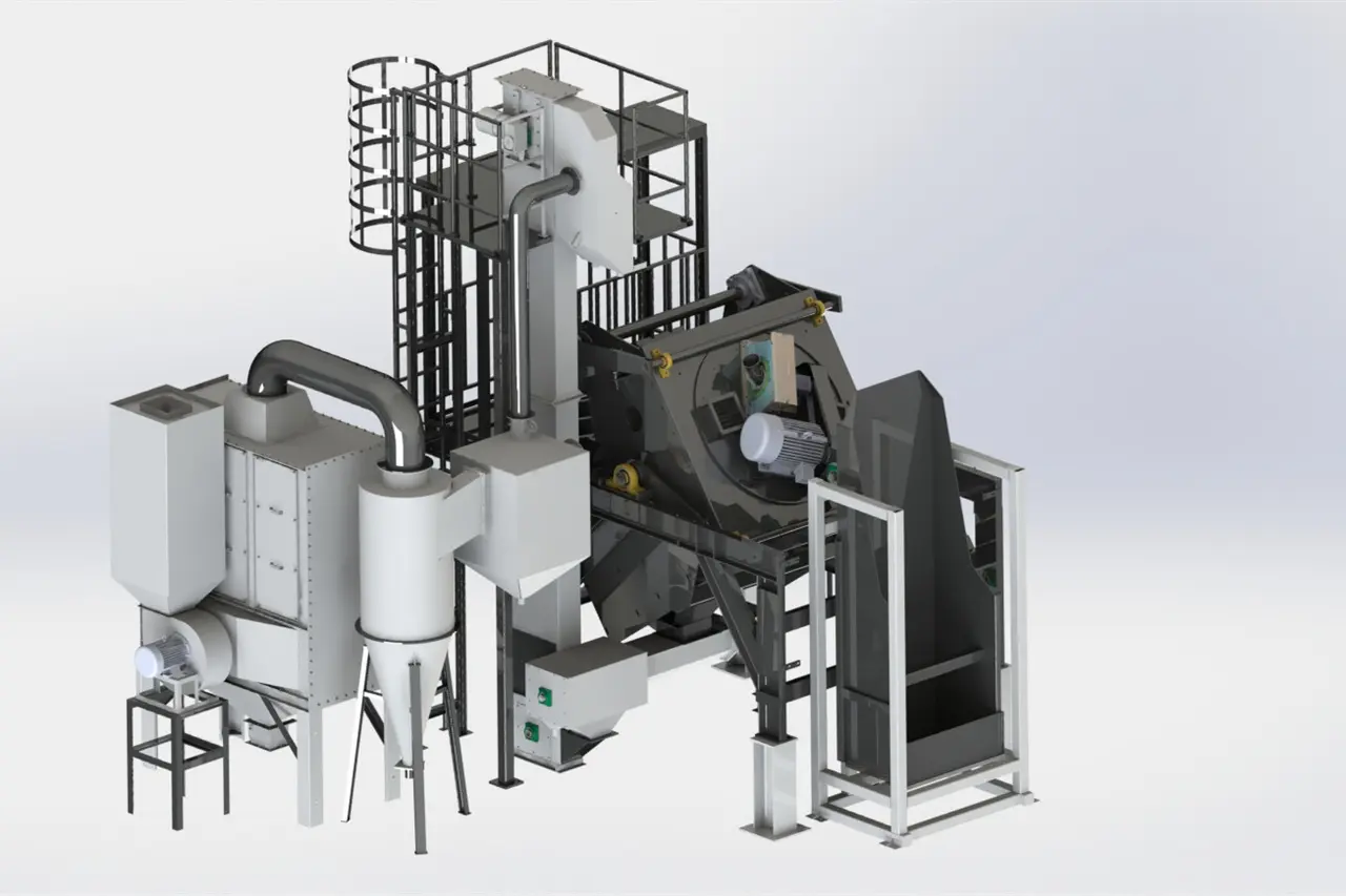 the tumble shot blasting machine is mainly composed of a drum, a separator, a blasting machine, a hoist, a gear motor and the like.